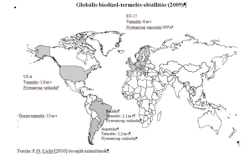 A biodízel-előállítás és -felhasználás ma főleg Európára és kisebb mértékben az USA-ra koncentrálódik, bár az utóbbi években több ország is bekapcsolódott a biodízel-gyártásba. 2009-ben 15 millió tonna globális biodízel-termelésből az EU 8,0, az USA 1,9, Argentína 1,3 és Brazília 1,1 millió tonnát állított elő (2. ábra). A 2009-ben előállított 15 millió tonna biodízel a világ dízelfogyasztásának 1%-át tette ki (térfogat egyenértékben).