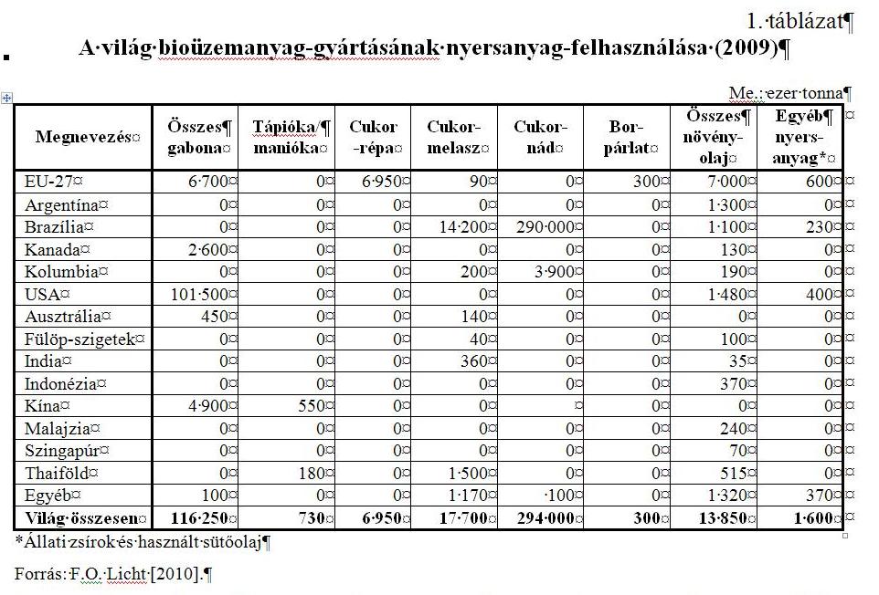 Világviszonylatban azonban a gabonafélék és olajnövények etanol- és biodízelgyártásra felhasznált mennyiségének összes termeléshez viszonyított aránya egészen más képet mutat (1. táblázat). A bioüzemanyag célú etanolgyártásra 2009-ben a globális gabonatermelés 7%-át használták fel (2006-ban 3,3%-át). Hozzá kell tenni, hogy a 7%-os arány a bruttó gabona-felhasználást jelenti. Ha az etanolgyártás melléktermékét, a nedves és száraz gabonatörkölyt is figyelembe vesszük, akkor a 2009. évi üzemanyag célú nettó gabona-felhasználás a globális termelés csupán 4,7%-át tette ki (2006-ban 2,2%-át). 2006-2009 között a globális gabona-felhasználás 9%-kal, 1,8 milliárd tonnára, míg az üzemanyag célú etanol-termelés kereslete 54-ről 116 millió tonnára emelkedett. A gabona-alapú etanolgyártás vezető országai az USA, az EU és Kína. Az USA-ban a gabona 30%-át, az EU-ban 3%-át és Kínában 1,5%-át használták fel etanolgyártásra 2009-ben.
