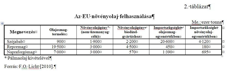 A biodízel-gyártás hatása a globális növényolaj piacra már sokkal jelentősebb, mert 2009-ben a globális növényolaj termelés 11%-át (2006-ban 5%-át) használták fel ilyen célra. Az EU-27-ben a biodízel iránti növekvő kereslet nem elégíthető ki az EU-ban előállított olajnövényekből. Jelenleg az olajnövény termelés évi 11-12 millió tonna között mozog növényolaj-egyenértékben kifejezve, ebből 8 millió tonna az étolaj felhasználás és 7-8 millió tonna szükséges biodízelgyártásra (2. táblázat). Ez azt jelenti, hogy mintegy 5 millió tonna növényolaj importra van szükség vagy ezzel egyenértékű olajosmag behozatalra. Az állati zsírok és használt sütőolaj aránya a biodízelgyártásra felhasznált nyersanyagokban nem éri el a 10%-ot (az USA-ban 25% ez az arány).