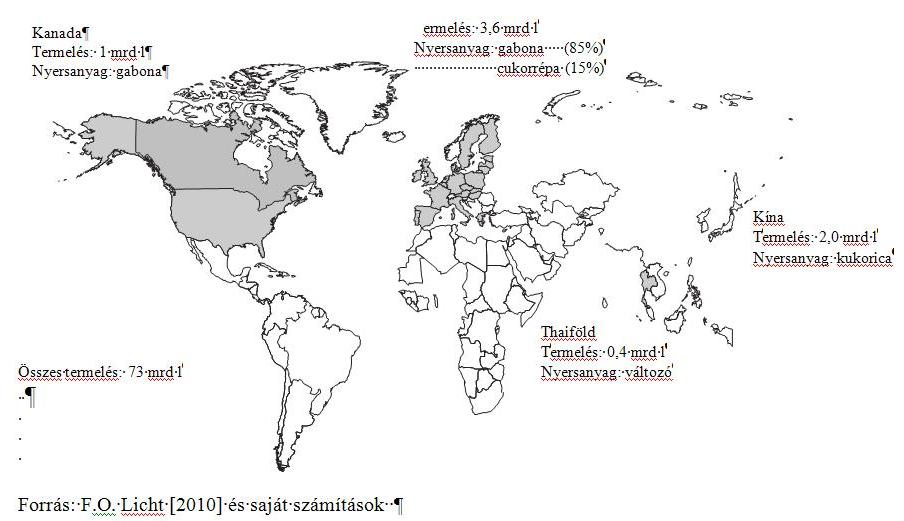 A globális etanoltermelés mintegy 80%-a bioüzemanyagként kerül felhasználásra, a fennmaradó részből szeszesital és ipari alkohol készül. A 2009-ban előállított 73 milliárd liter üzemanyag célú etanol a világ benzinfogyasztásának 2-3%-át tette ki (térfogat- egyenértékben). Az üzemanyag célú etanolgyártás alapanyagának 55%-át a kukorica, 34%-át a cukornád, 6%-át a melasz, 3,5%-át a búza és 1,5%-át egyéb nyersanyag tette ki. 2009-ben a bioetanol-üzemanyag legnagyobb előállítója 41 milliárd literrel az Egyesült Államok lett, megelőzve a korábbi piacvezető Brazíliát, ahol 24 milliárd liter üzemanyagcélú etanolt termeltek (2008-ban is ennyit állítottak elő). Jelentős lemaradással 3,6 milliárd literrel a harmadik legnagyobb termelő az Európai Unió volt. Kína 2,0 milliárd liter termelésével a negyedik helyre szorult (1. ábra). Említést érdemel még Kanada, Ausztrália és néhány ázsiai ország (India, Thaiföld) etanolgyártása, de Közép-Amerikában és Afrikában is nő a termelés [F.O. Licht, Vol. 8, No.16, 2010].