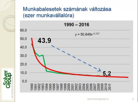 - A csökkenésben jelentős szerepet játszik, hogy a multinacionális cégek magyarországi befektetéseik révén magukkal hozták a hazainál általában magasabb színvonalú munkavédelmi kultúrájukat és a munkavédelem magas színvonalon tartását megkövetelő minőségbiztosítási rendszerüket, e szemléletet és szabályozást követelték meg üzleti partnereiktől is. A kkv-szektor vállalatai idehaza a globalizált világ részeként így e multinacionális környezet résztvevőjeként tevékenykednek, tehát számukra a magas szintű munkavédelmi kultúra kialakítása és a „compliance”, azaz a megfelelőségi szabályozás kötelező feladattá vált. Ez hozta a drámai baleseti szám csökkenését 1991-2000. között.