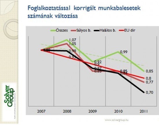 Az OMMF oldaláról letölthető baleseti adatokat korrigáltuk a KSH oldalán lévő foglalkoztatási adatokkal - figyelembe véve a csökkenő foglalkoztatást - és a fenti statisztikai képet kaptuk. A pirossal jelölt "EU dir" iráényvonal azt az Európai Uniós csökkenő célfüggvényt mutatja, mely szerint 25%-kal kellene csökkenteni a balesetek számát 2013 végére.