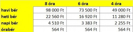 Az elvégzett munkáért a munkavállaló részére a munkaszerződésben megállapított munkabér jár. A munkabért meg lehet állapítani időbérben (havi, heti, napi vagy órabér), vagy teljesítménybérben is. A munkabérben a felek szabadon állapodnak meg, a munkajogi szabályok meghatározzák azonban azt a legkisebb összeget, az ún. minimálbért, amelyet a munkavállalónak a megállapított munkaidő ledolgozása esetén mindenképpen meg kell kapnia. A kötelező legkisebb munkabér (minimálbér) összegét 2013. évre vonatkozóan jelenleg a 390/2012. (XII.20.) Korm. rendelet határozza meg. A minimálbér összege a napi 8 órás teljes munkaidőre vonatkozik, részmunkaidős foglalkoztatás esetén ennek időarányos részét kell megfizetni. Az alábbi táblázatban mutatjuk be, hogy mely díjazási formákban milyen összegű minimálbért kell megállapítani.